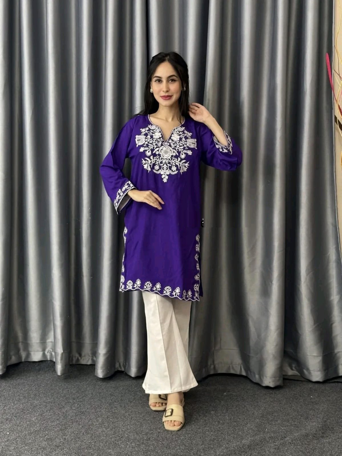 আপনার প্রতিদিনের স্টাইলে আভিজাত্য যোগ করতে বেছে নিন এই সুন্দর ড্রেসটি। হালকা ল্যাভেন্ডার রঙের সাথে নিখুঁত সাদা সুতার কাজের কম্বিনেশন আপনাকে দেবে এক স্নিগ্ধ লুক।